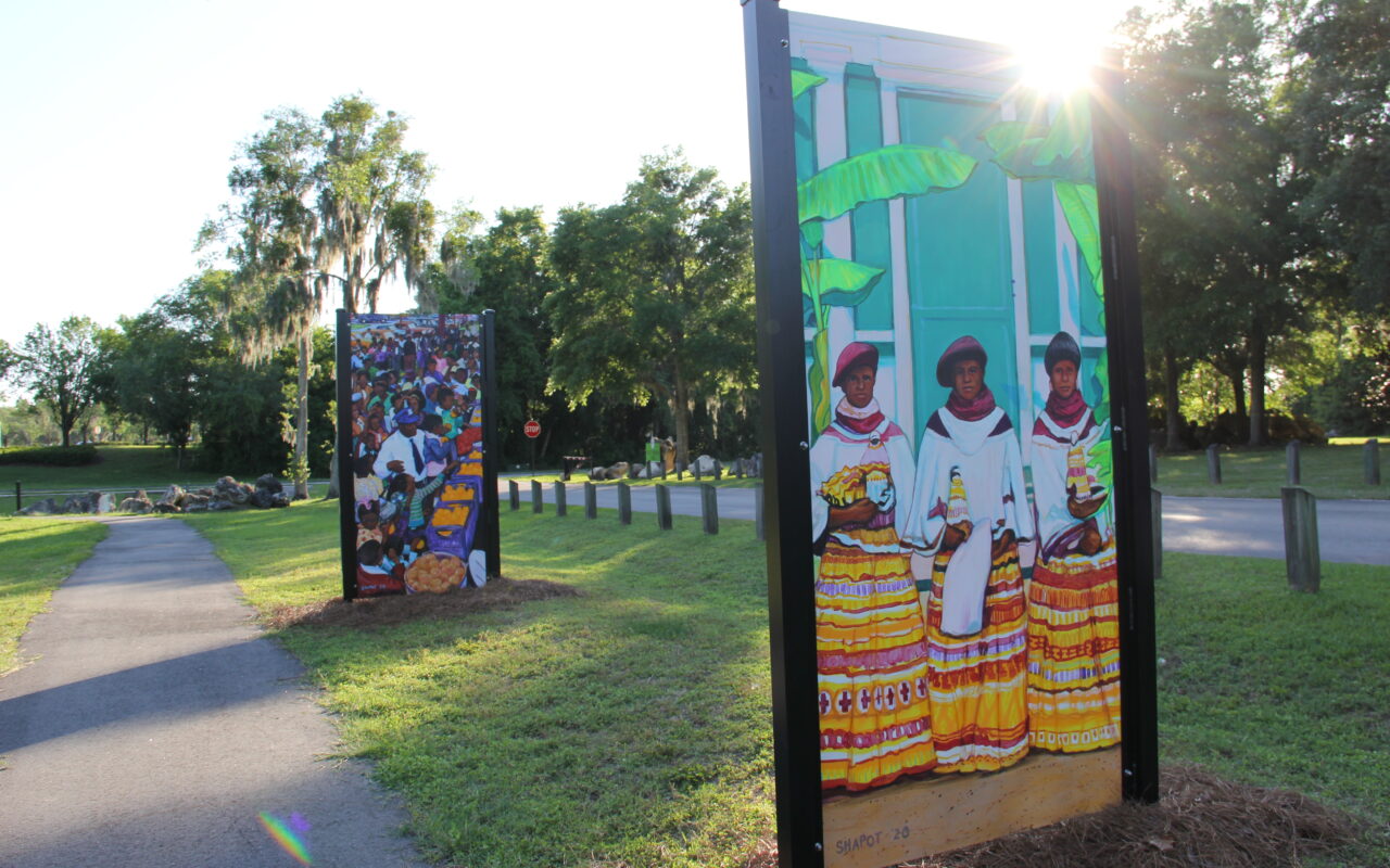The City of Ocala Municipal Government, through its Ocala Cultural Arts division, announces the installation of four mural panels at Scott Springs Park, located at 2825 SW 24th Avenue. The double-sided panels feature two separate mural exhibits, A Journey Though Marti City by Maggie Weakley and Glimpses into the History of Marion County’s Black Culture by Jordan Shapot.