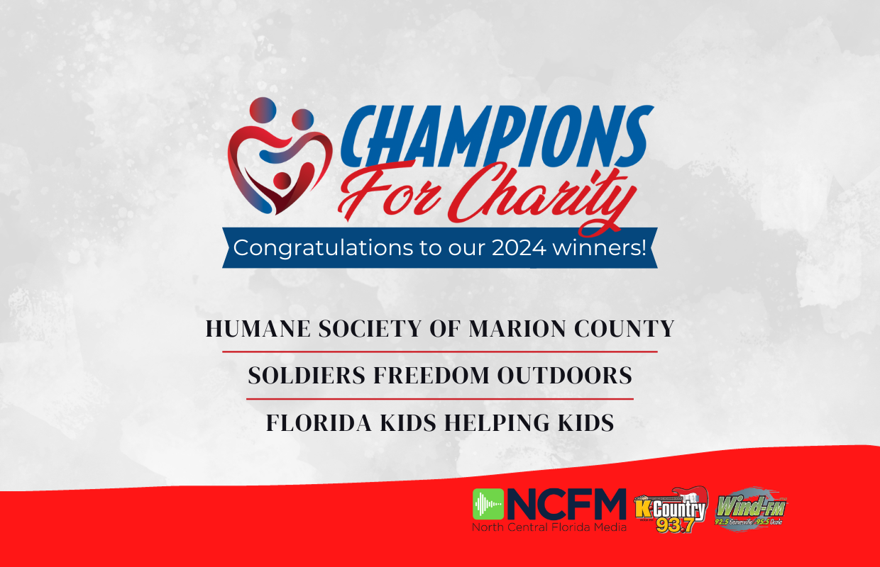 Submission Phase: December 4, 12:00am through December 17, 11:59pm. Listeners can submit a charity to be nominated for the Champions for Charity promotion at www.windfm.com/contests. All nominees must have headquarters within 75 miles of the NCFM offices at 1901 E Fort King Street, Ocala, Florida 34471. Each nominee be screened by a North Central Florida Media Group staff member and must be a 501(c)(3) organization. The nominees must be considered an organization that helps children, animals, or veterans, all others will be removed from the nominee list. Charities that won the Champions for Charity contest in 2022 or 2023 are not eligible to win the Champions for Charity contest in 2024.