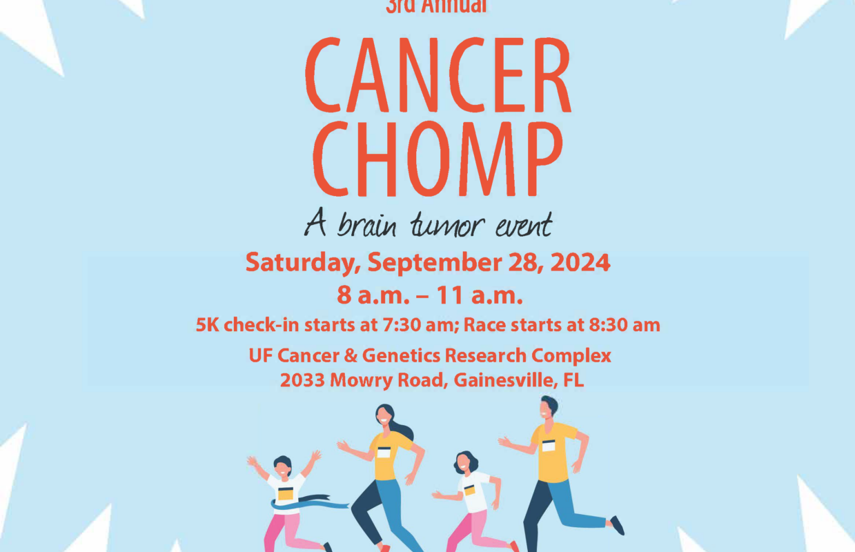 Please join in for the 3rd annual Cancer Chomp, a brain tumor event presented by the Preston A. Wells Jr. Center for Brain Tumor Therapy in conjunction with the Department of Neurosurgery at the University of Florida. Cancer Chomp will take place from 8am – 11am on Saturday, September 28th at the Cancer & Genetics Research Complex on the beautiful University of Florida campus located in Gainesville, FL. This event will include a 5K run/walk, Kid Zone, charitable organizations, community vendors, mini therapy horses, the UF Gator Mascots, the UF Gator Band, and more. The event is free to attend though there is a small fee to participate in the 5k run/walk. Registration for the 5k is open now until midnight on September 16th and will open again on the morning of the event. For more details or to register for the 5k, please visit our website: Giving.UFHealth.org/CancerChomp
