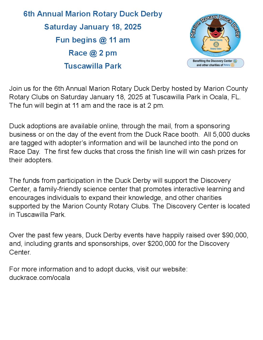 For more information and to adopt ducks, visit our website: duckrace.com/ocala