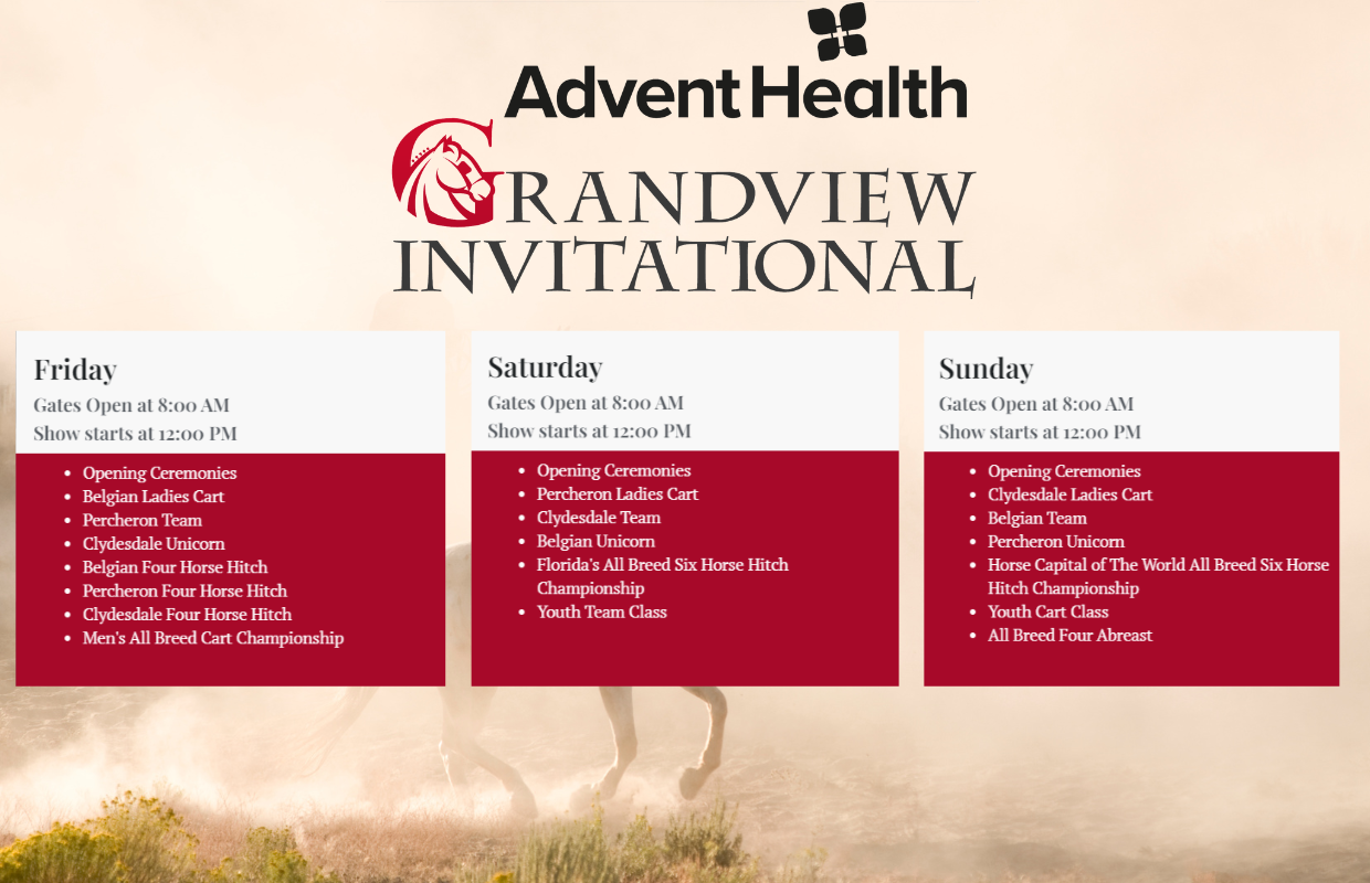 The Grandview Invitational is a 3 day competition located at the Florida Horse Park, Ocala FL. Gates open at 8am, competition starts at 12 noon each day and finishes up around 3pm. This is a horse competition that will captivate even the non-horse loves of the area. Just by their size alone is jaw dropping.