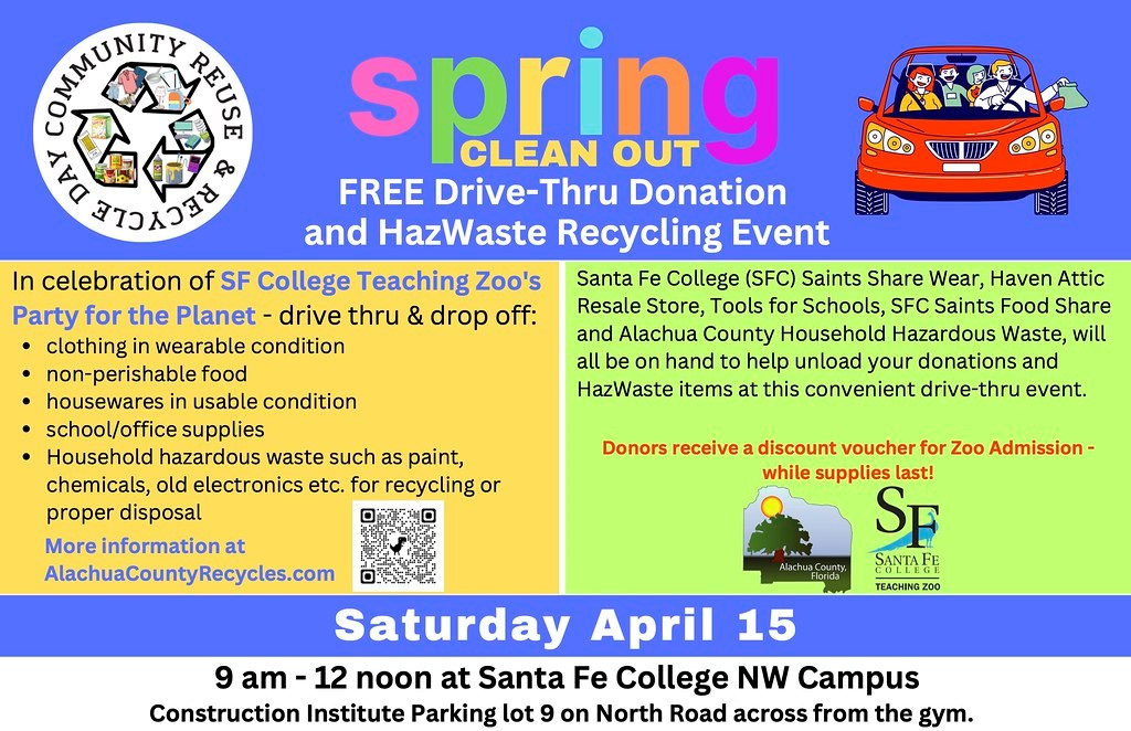 The Alachua County Solid Waste & Resource Recovery Department, in collaboration with the Santa Fe College Teaching Zoo, invites residents to participate in the “Community Reuse & Recycle Day” on Saturday, April 15th, 2023. Residents are encouraged to take advantage of this free spring clean out, donation, and Hazardous Waste Recycling Event.