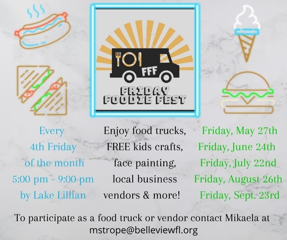 Friday Foodie Fest Belleview Share on Facebook (Opens in new window) Facebook Share on X (Opens in new window) X Share on Bluesky (Opens in new window) Bluesky Share on Reddit (Opens in new window) Reddit When Aug 26th, 2022 5:00pm - 9:00pm Where SE Robinson RoadBelleviewFl34220 Calendar • Belleview, FL • CivicEngage (belleviewfl.org) Share on Facebook (Opens in new window) Facebook Share on X (Opens in new window) X Share on Bluesky (Opens in new window) Bluesky Share on Reddit (Opens in new window) Reddit
