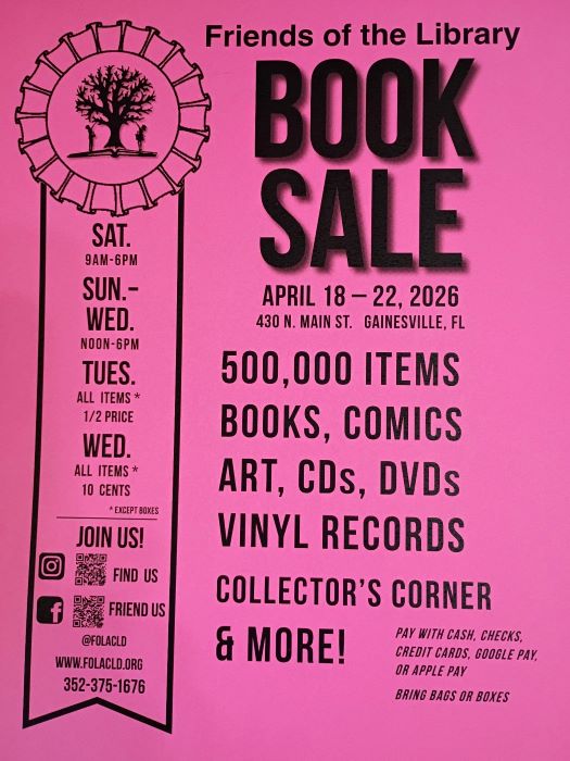 Friends of the Library Alachua County will have their Spring Book Sale Saturday April 18, from 9AM to 6PM, and Sunday April 19 through Weds April 22 from Noon to 6PM. Over 500,000 items. Books, comics, puzzles, games, artwork, CDs, DVDs, vinyl records and more. Bring your own bags or boxes. Pay with cash, checks, credit cards, Google Pay or Apple Pay. Tuesday is 1/2 price day on most items, and Weds is 10 cent day on most items.