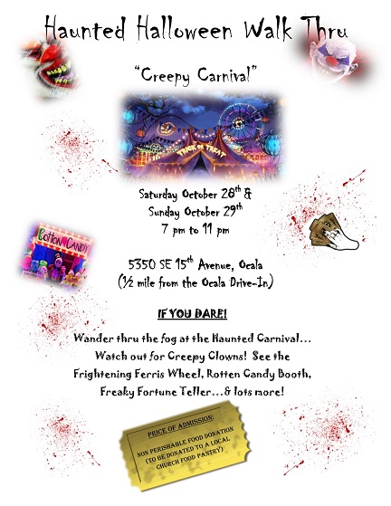 Haunted Carnival When Oct 28th, 2023 - Oct 29th, 2023 7:00pm - 11:00pm Where 5350 SE 15th AveOcalaFlorida34480