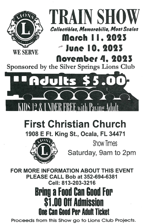 See Collectibles, Memorabilia, Most Scales and more. Sponsored by the Silver Springs Lions Club, all Proceeds from this show go to the Lions Club Projects.