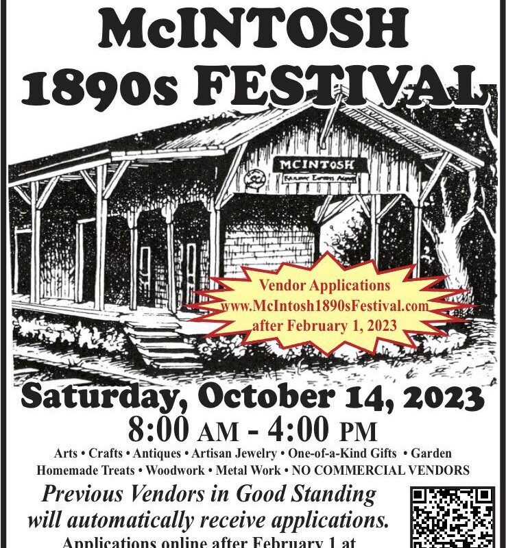 McIntosh 1890s Festival is back! Over 250 arts, crafts, antiques & plants vendors from around the country. Delicious options from food vendors are offered and all day free musical entertainment is on stage at Van Ness Park. GPS address is 5835 Avenue G, McIntosh 32664. McIntosh is on Highway 441 midway between Ocala and Gainesville.
