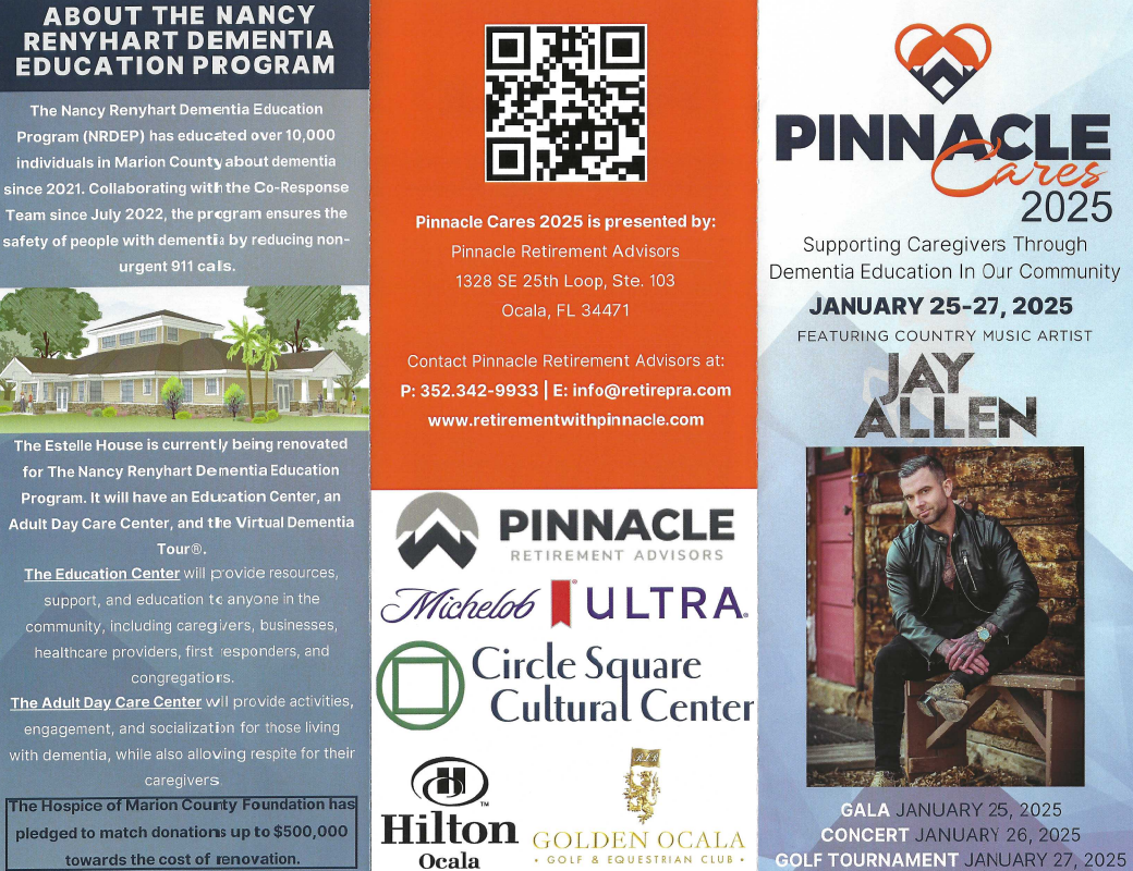 Pinnacle Retirement Advisors believe in the power of community, the importance of giving back and the ripple effect that one act of kindness can create. Pinnacle Cares was created out of this belief, allowing us to showcase the charities we passionately support while reflecting our dedication to positive change. Dementia affects so many people in our community. That’s why all the proceeds from Pinnacle Cares 2025 will fund the opening of the Dementia Center located at the Hospice of Marion County Campus. The center will provide ongoing resources and support for families in our community.