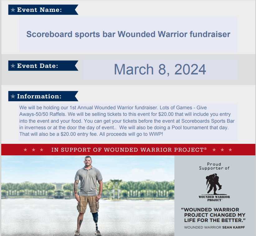 Pre-sale tickets can be purchased at Scoreboard Sports Bar in Inverness (or available at the door on the day of the fundraiser). Tickets are $20 for entry and food! ALL PROCEEDS WILL GO TO WWP!