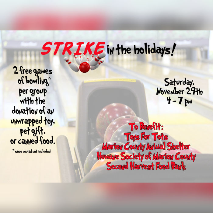 Come STRIKE in the Holidays while helping those in need. Two free games (per group/family) of bowling with the donation of an unwrapped toy, dog or cat item for the local shelters, or canned food. To support Toys for Tots, Marion County Animal Shelter, Humane Society, and Second Harvest Food Bank. Come have fun while making a difference!