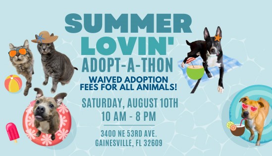 Alachua County Animal Resources and the Student Chapter of the Association of Shelter Veterinarians – UF Chapter are hosting the 14th Annual Summer Lovin’ Animal Adoption event. Summer Lovin’ is on Saturday, Aug. 10, 2024, from 10 a.m. to 8 p.m. at the Alachua County Animal Resources Headquarters (3400 NE 53rd Ave., Gainesville).