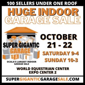 The Super Gigantic Garage Sale is set for October 21-22, 2023. Come to the LARGEST INDOOR garage sale to see what you can find! Where else can you shop hundreds of garage sales all under one roof? Come on out for the biggest INDOOR garage sale in the area, happening at the World Equestrian Center in Ocala on Saturday, October 21st, and Sunday, October 22nd. This event offers a variety of rare finds from homeowners and collectors, such as housewares, furniture, kid’s items, antiques, jewelry, collectibles, and more! Don’t miss out on the chance to discover unique treasures. Save your time and gas money by attending this fun and popular event!