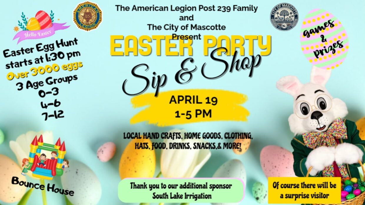 The American Legion post 239, The city of Mascotte, and sponsored by Southlake irrigation presents The easter party. We have 3300 easter eggs, stuffed with candy, toys, and some special items. 3 age groups for the easter egg hunts 0-3 starts at 2:00, 4-6 age group starts at 2:30, and 7-12 age group starts at 3:00. There will be a golden egg winner in each group for the most eggs collected. Also for the kids we have a 40’ obstacle course, a duck pond, axe throw (not real axes), baseball throw, dunk a duck, and milk jug toss. Let’s not forget corn hole, and horseshoes. For our shoppers we have vendors, for crafts and resale items, as well as food, drinks, music, and more, Lots of prizes for the kids, the easter bunny and free face painting. This is a free event for our community. We invite you out to have a good time. Open to the public and fun for all ages.