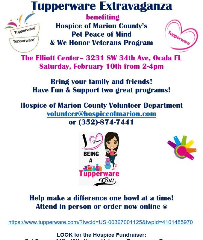 Tupperware Extravaganza benefiting Hospice of Mairon County’s Pet Peace of Mind & We Honor Veterans Program. Bring your family and friends! Have fun and support 2 great programs. For more information contact Hospice of Marion County Volunteer Department: 352-874-7441 or volunteer@hospiceofmarion.com