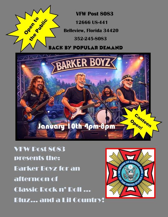 Back by popular demand, VFW Post 8083 presents The Barker Boyz in concert in the main hall on Saturday, January 10, 2026, from 4 p.m. to 8 p.m. Free and open to the public.
